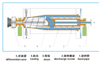 待處理的料漿經進料管進入機內,隨轉鼓一起旋轉,由于料漿中不同粒徑粒子的密度 差,在離心力的作用下,就使得密度大的粗粒子沉降于轉鼓內壁并由螺旋推料器推送到轉鼓小 端出口由離心力卸出,而由細粒子形成的細漿則成為一個內環,轉鼓里面環形液層深度可通過 轉鼓蓋上的溢料擋板調節。分級后的細漿就經溢流口排出,回收的沉渣(粗粒子)由螺旋推料器 推出。