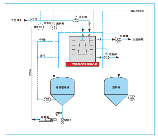 ZD2000F分級系統的工作流程分為兩個步驟 第一步分級,離心機轉子旋轉過程中,懸浮液連續不斷地輸送到系統中,同時粗渣和凝聚物收集在分級腔中, 懸浮液通過單獨的分級環室,從分級腔頂部邊緣送出,出口位置高于轉子頂部,成為可立即使用的清液。 第二步分散,當分級腔內填滿超過60%容積的粗渣時,轉子速度將會降低到預先設定的分散速度。啟動分散裝 置時,少量的稀釋液會不斷地打進分級腔內。分散流程持續以減速進行,在所有的環室清潔后,排除的粗渣用泵抽 走。在再次啟動之前,分級腔將短暫停止運行,以使得滯留液體可完全流出系統。 精確的分級系統,使得只有小部分(粗大粒子)需要刮削處理。這對于需要處理的物料而言,是極少量的,因此 減少了污染的過程,能夠大大提高效益。